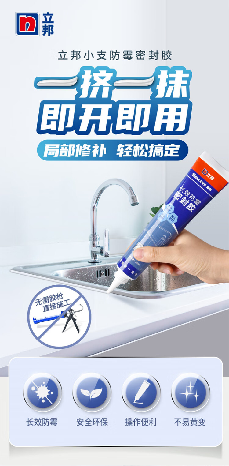 立邦 长效防霉玻璃胶 厨卫台盆马桶防水密封胶美容收边胶 白色150ml